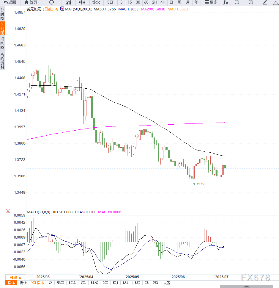技术面支持美元/加元在当前区间内震荡运行,需关注后续7月21日前的美加协议进展,以及8月1日前美方是否扩大制裁范围。